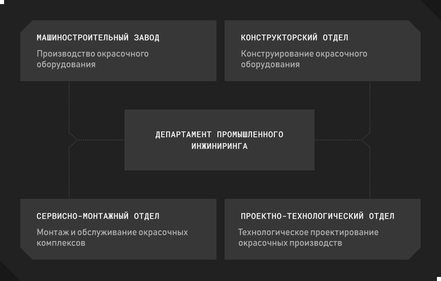 Деятельность сконцентрирована на решении задач в области промышленной окраски, от технологического консалтинга до изготовления и обслуживания покрасочного оборудования