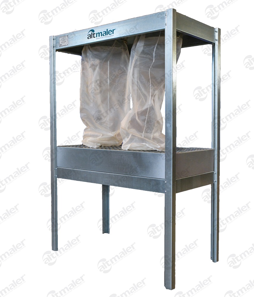 Работает в замкнутом цикле. Загрязненная лакокрасочными отходами вода из окрасочной камеры подается по шлангам в верхнюю ванну сборника отходов с помощью насоса, который идет в комплекте. Из верхней ванны через фильтрующие мешки вода поступает в нижнюю ванну и очищенной подается по шлангам обратно в камеру.