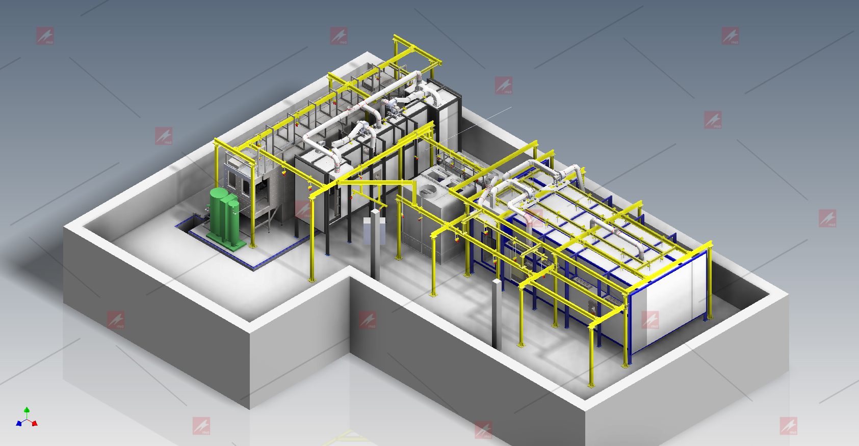 Изделия в зоне загрузки оператором загружаются на подвесочное приспособление конвейерной системы. Далее изделия направляются в агрегат химической подготовки поверхности (АХПП), где последовательно проходят через зоны фосфообезжиривания, промывки питьевой и деминерализованной водой. Затем изделия направляются в сушильную камеру для удаления влаги с поверхности. Изделия проходят через однопостовую камеру с сухой системой фильтрации вытяжного воздуха, в которой маляр методом ручного пневматического распыления наносит покрытие на поверхность изделия. Предусмотрено автоматическое вращение изделий в зоне окрашивания для качественного окрашивания изделий со всех сторон. После нанесения лакокрасочного материала изделия направляются в камеру сушильную, где при температуре 100 °С происходит формирование покрытия. Далее изделия направляются в зону разгрузки, где производится разгрузка изделий и контроль качества покрытия.