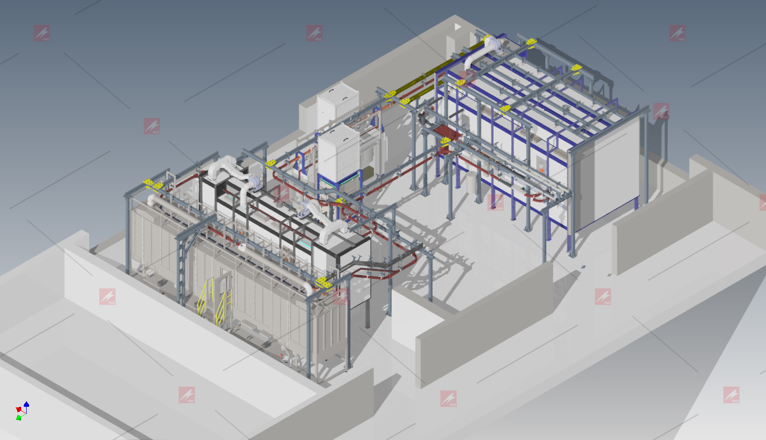 Изделия в зоне загрузки оператором вручную загружаются на подвесочное приспособление подвесного автоматического конвейера. Далее изделия направляются в агрегат химической подготовки поверхности (АХПП), где последовательно проходят через зоны фосфообезжиривания, первой промывки и заключительной промывки деминерализованной водой. После АХПП изделий направляются в сушильную камеру для удаления влаги с поверхности. Далее изделия проходят через двухпостовую камеру с откатными картриджными блоками для возможности смены цвета, где маляры электростатическим методом наносят ЛКМ на поврехность изделий. Предусмотрено дополнительное механическое вращение изделий в зоне окрашивания. После нанесения ЛКМ изделия направляются в камеру полимеризации, выполненную с тепловым подпором для предотвращения выбивания горячего воздуха из камеры в цех, где происходит формирование лакокрасочного покрытие. Далее изделия направляются в зону разгрузки, где оператором вручную снимаются с подвесного приспособления конвейера.