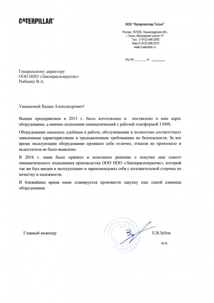 По итогам поставок оборудования компании Caterpillar, НПО "Лакокраспокрытие" получило благодарственное письмо, в котором дана высокая оценка нашей продукции и сообщается о планах на дальнейшее сотрудничество. Компания Caterpillar — мировой лидер в производстве строительного и горного оборудования, двигателей, работающих на природном газе и дизельном топливе, а также промышленных турбин и дизель-электрических локомотивов.