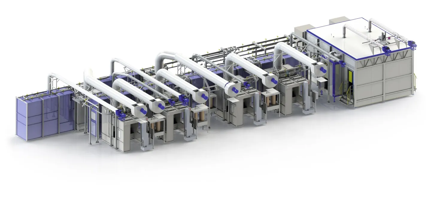 Изделия вручную подвешиваются на поворотные подвески конвейера. Изделия последовательно проходят две камеры обезжиривания, оснащенные установками автоматического обезжиривания и туннель естественной сушки. Далее изделия окрашиваются в 3 – 4 слоя (в зависимости от технологического процесса) жидкими ЛКМ. Нанесение ЛКМ осуществляется на вращающиеся изделия с помощью автоматических краскораспылителей, закрепленных на манипуляторе. Для очистки воды в ваннах гидрофильтров, камеры окрашивания оснащены сборниками отходов с мешочными фильтрами. После нанесения каждого слоя ЛКМ изделия направляются в камеру естественной сушки, за исключением финишного покрытия. Финальный слой ЛКМ отверждается в сушильной камере. В зависимости от времени сушки финального слоя ЛКМ работает одна либо сразу две секции сушильной камеры. Далее изделия направляются на разгрузку.