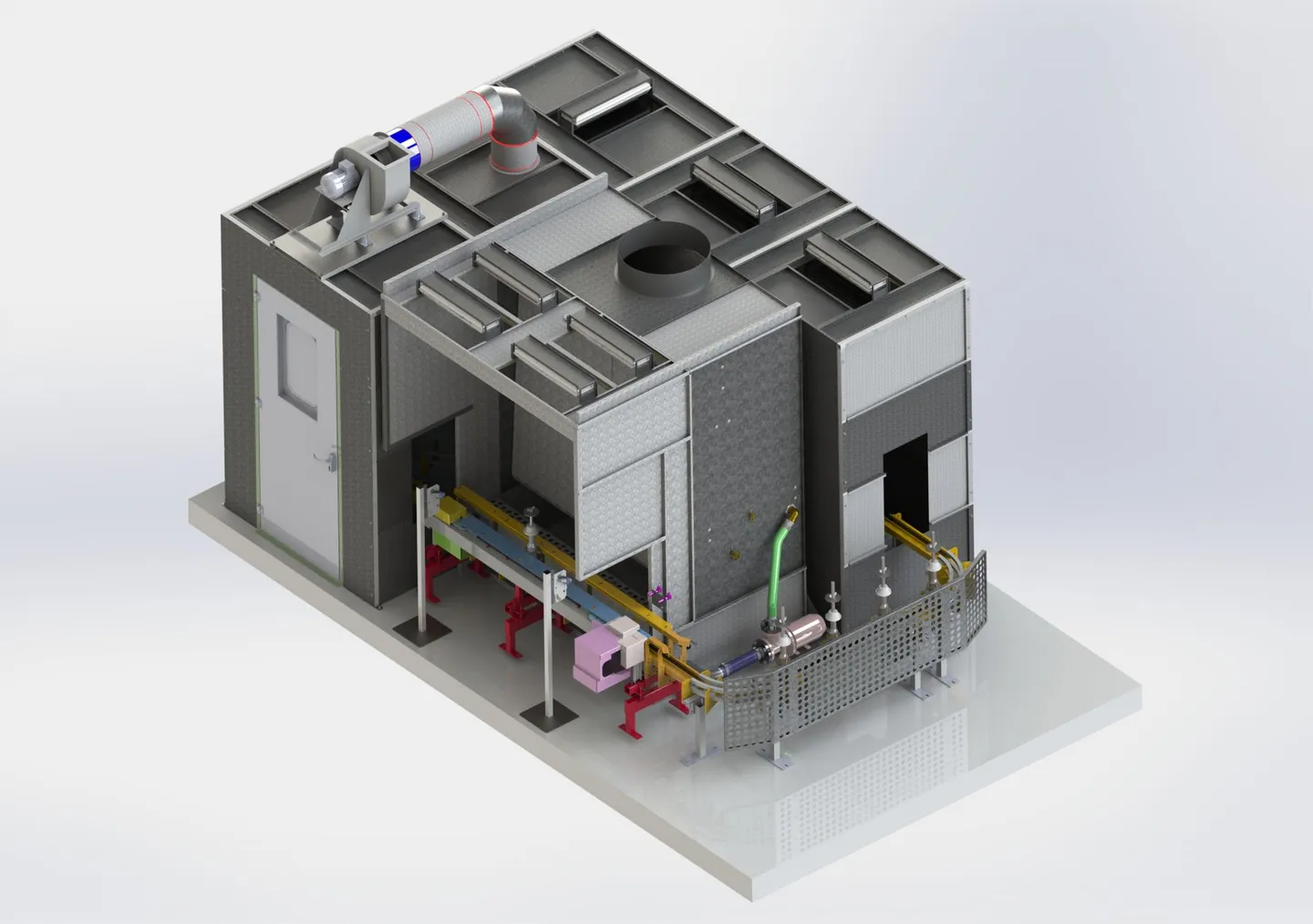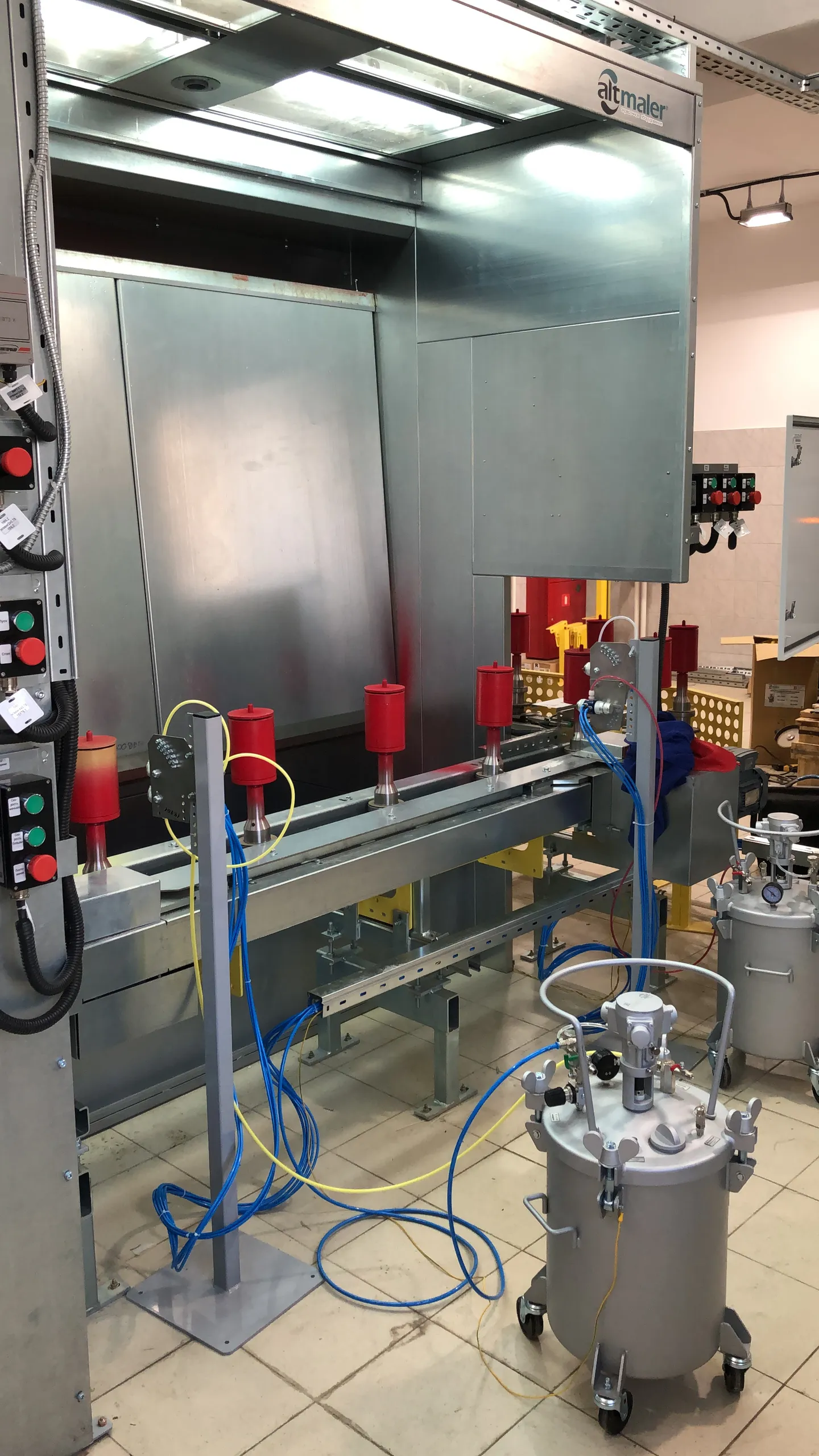 Изделия вручную устанавливаются на вращающиеся подвески конвейера, после чего перемещаются в камеру окрашивания с гидрофильтрацией. Нанесение ЛКМ в камере выполняется на двух рабочих позициях. На первой позиции муфта окрашивается полностью, на второй — наносятся кольцевые полосы. При окрашивании изделия вращаются вокруг своей оси. На шкафу управления оператор выбирает цвет наносимого ЛКМ (№1 или №2), а также количество наносимых кольцевых полос одна/две. Окрашенные изделия поступают в камеру выдержки для сушки ЛКМ, и далее на разгрузку.