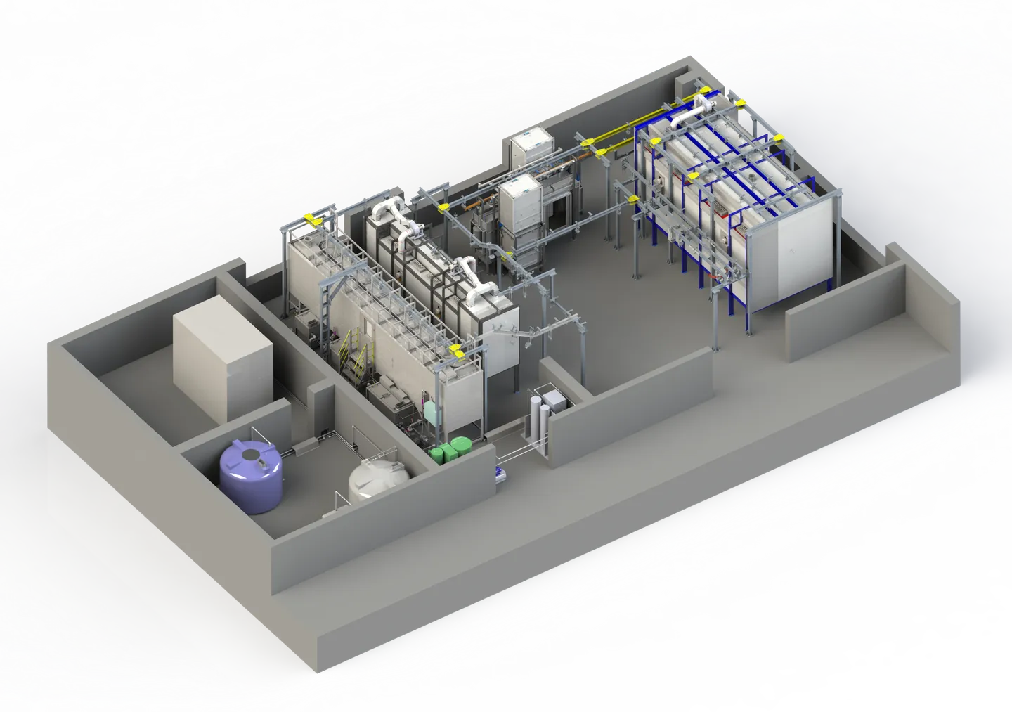 Окрасочный комплекс предназначен для химической подготовки поверхности, порошкового окрашивания с последующей полимеризацией модулей систем автоматического пожаротушения.