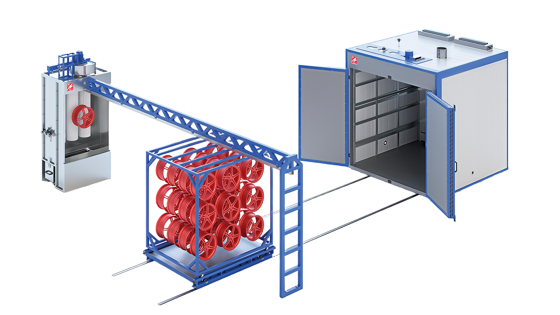 Далее окрашенный предмет перемещается на тележку напольной транспортной системы, которая рассчитана на размещение нескольких изделий. После полной загрузки тележки, оператор закатывает ее в камеру полимеризации и запускает процесс сушки. После окончания процесса полимеризации, оператор выгружает тележку из камеры и осуществляет разгрузку.