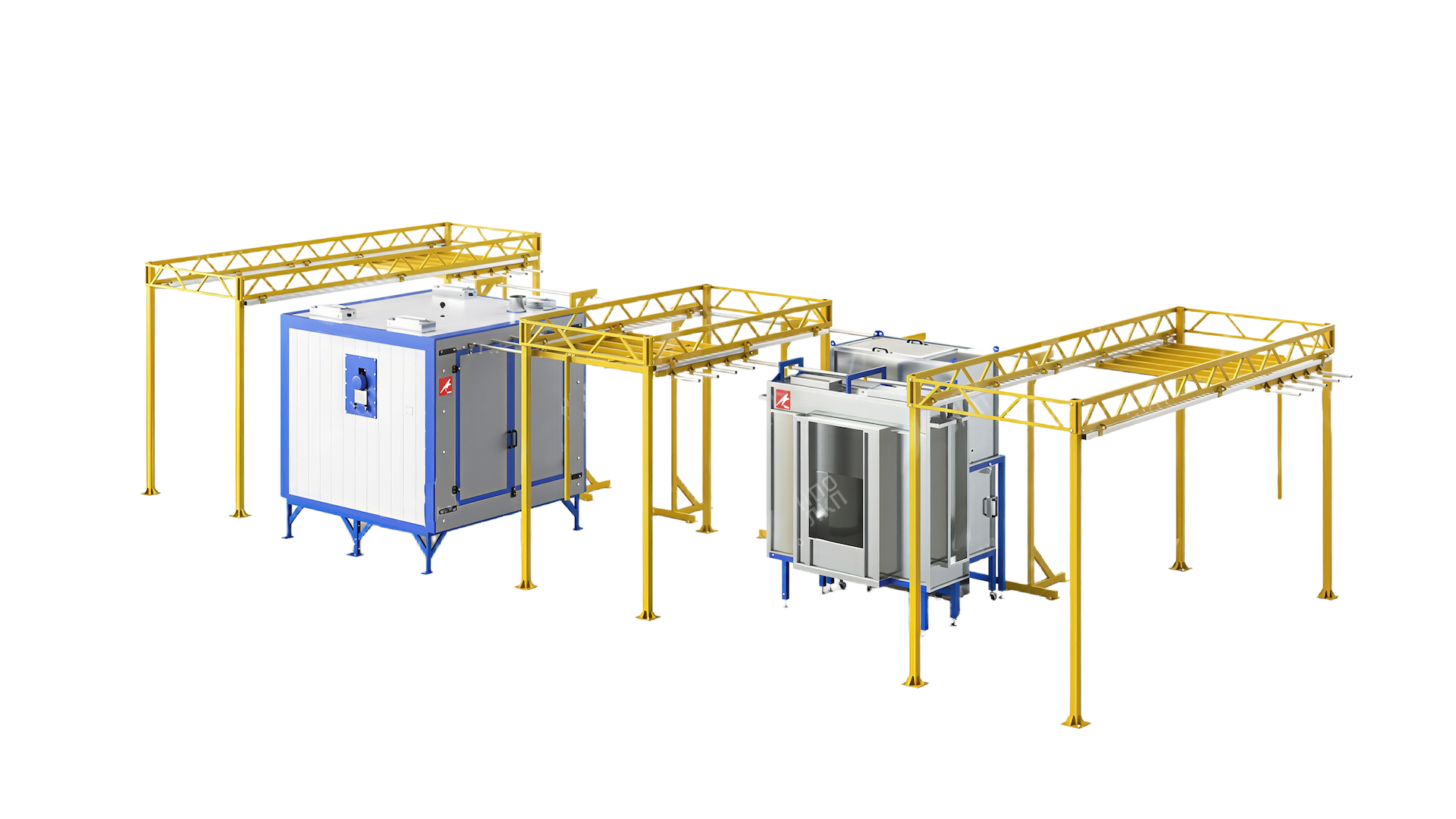 Участок окрашивания параллельного типа используется для нанесения и полимеризации порошковых покрытий на изделия среднего размера. Данная линия является базовым бюджетным решением для малого бизнеса. Отличается компактностью и может использоваться на ограниченной площади.