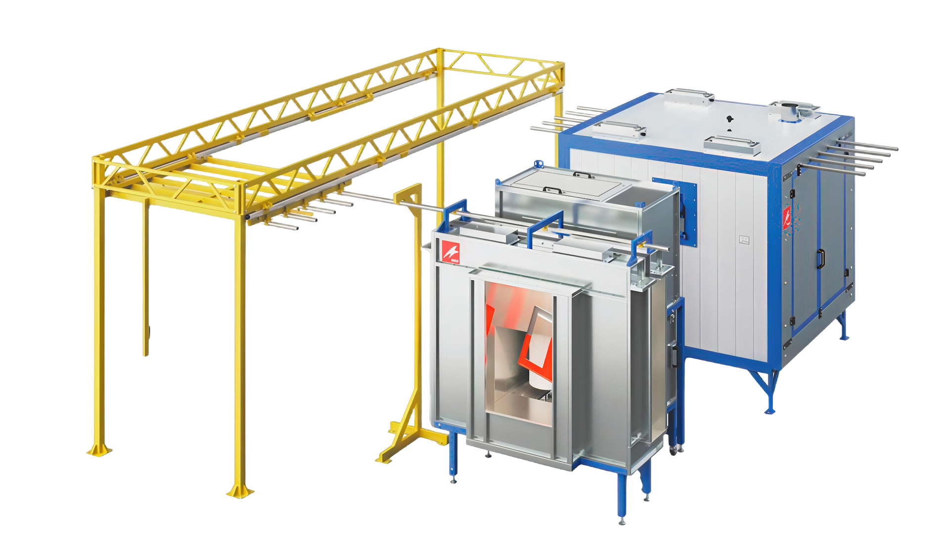 Далее окрашенный предмет перемещается на тележку напольной транспортной системы, которая рассчитана на размещение нескольких изделий. После полной загрузки тележки, оператор закатывает ее в камеру полимеризации и запускает процесс сушки. После окончания процесса полимеризации, оператор выгружает тележку из камеры и осуществляет разгрузку.