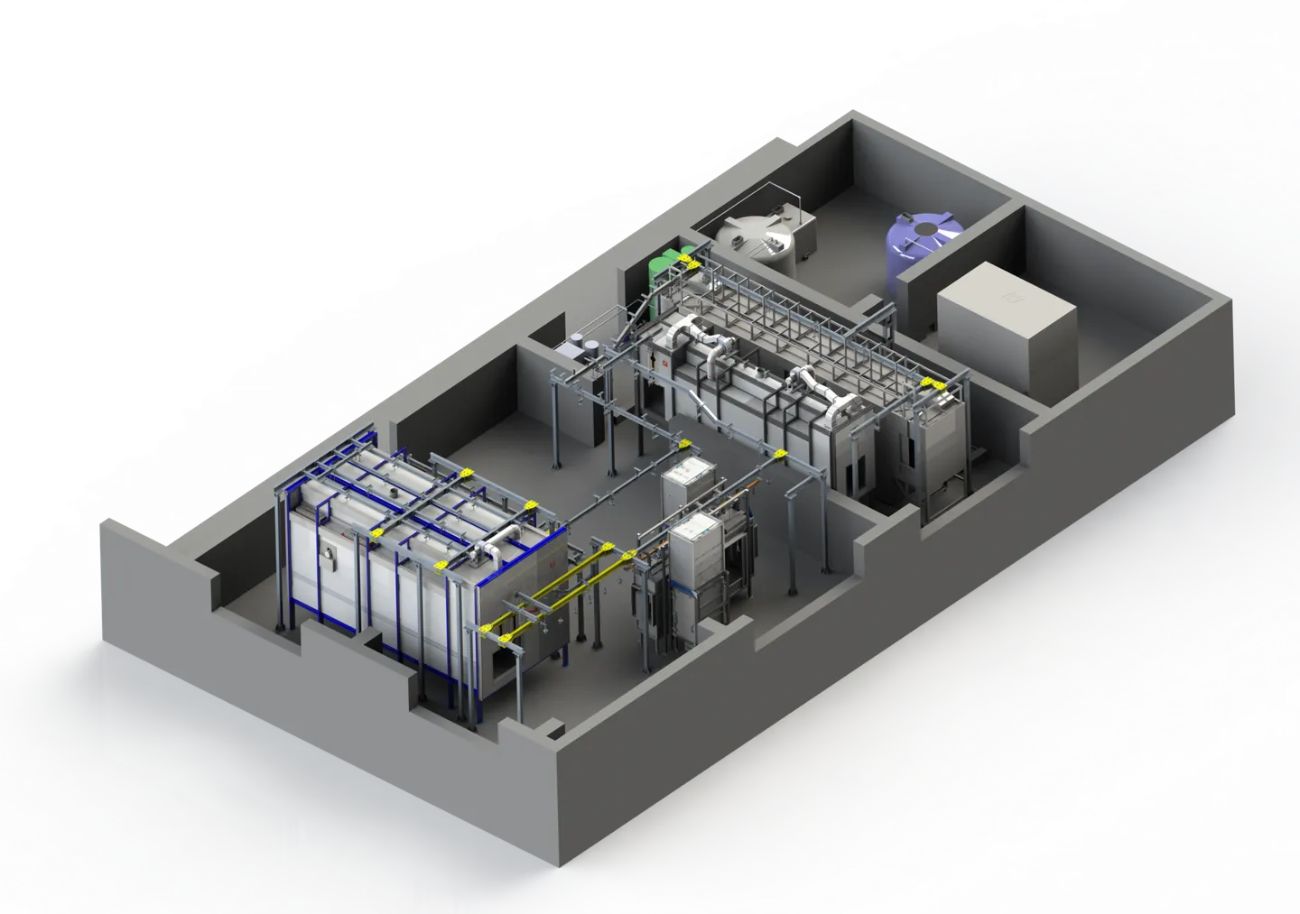 Окрасочный комплекс предназначен для химической подготовки поверхности, порошкового окрашивания с последующей полимеризацией модулей систем автоматического пожаротушения.